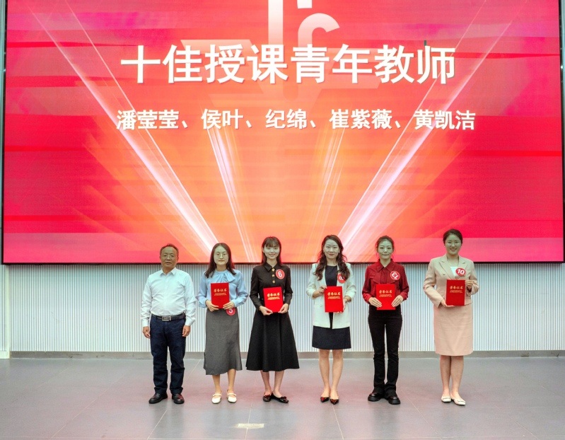 党委书记郑贤操为“十佳授课教师”颁奖,获奖教师由左至右:容哲、葛丽、陈小晰、张博、杨森