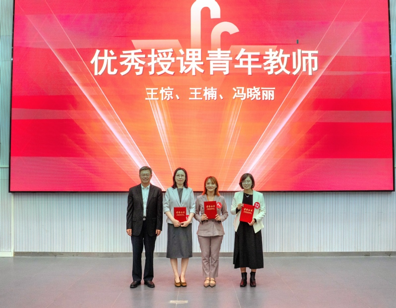 副校长陈国栋为“优秀授课教师”颁奖,获奖教师由左至右:王楠、冯晓丽、王惊