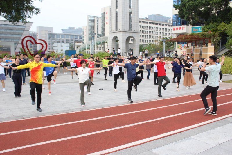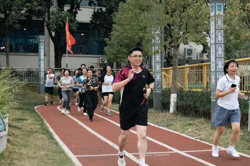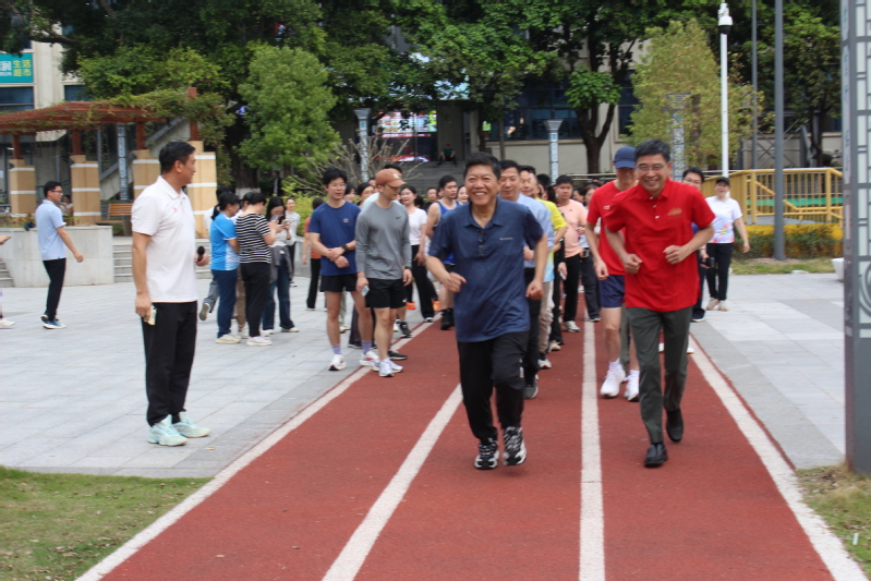 启动仪式上,工商管理学院辅导员李威威带领全体人员进行热身,为安全开跑做好充分准备。随后,刘祖华宣布活动正式启动,体育学院黄怀权副院长发令枪响,全体教职工沿体育公园跑道活力开跑。首次领跑志愿者李超威、梁铿浩、吴宏豪、王优信、李林、邵逸翔等老师具有跑马经验,活力满满,现场气氛热烈、一路欢声笑语。